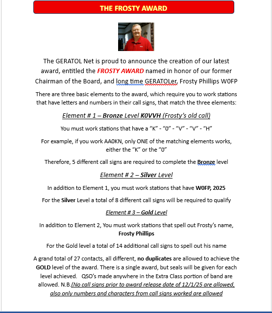 Let’s have fun working on this latest Award, and we are sure Frosty would be very appreciative of keeping his legacy with the GERATOL net for years to come !!